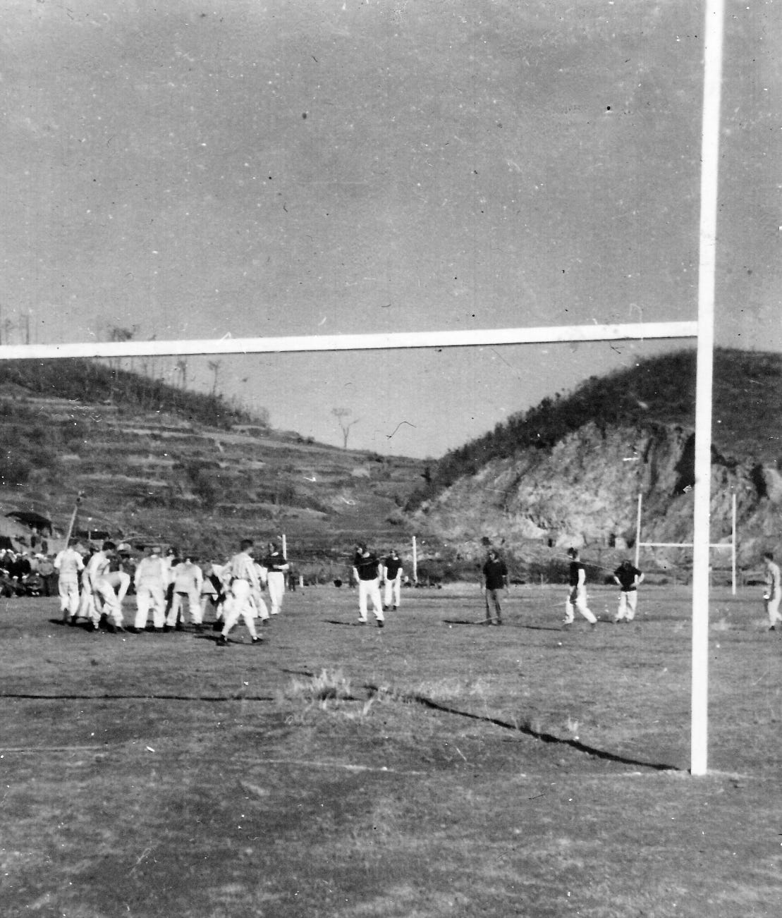 The crowd was composed mostly of noisy marines—including the two-star general himself. Also a handful of sailors and Naval Officers. There were only two wooden bleachers, so we followed the play up and down the sidelines. Here and there were isolated Japanese—a father and his boy, a group of giggly girls, two old men—all looking small and lost and bewildered by it all. Off in the distance on the fringes of the hills were little groups of Japanese regarding the strange Western spectacle in quiet isolation.