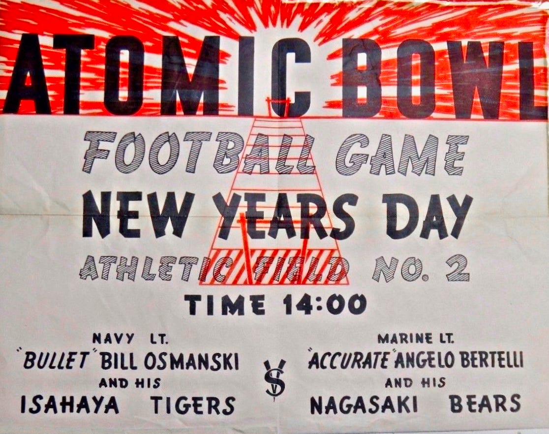 The Marines posted notices at barracks around Nagasaki. A top officer wrote a press release promising that the game, which he dubbed “the first annual Atom Bowl classic,” would have “all the color—and more” of the bowl games to be played that day back in the States, including a Marine band and Japanese girl cheerleaders. He advised, “Follow the signs to the parking lot and the bleachers.”